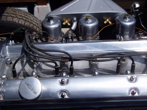 エンジンルームはアルミ磨き出しのヘッドカバーをはじめ、ほぼオリジナルです。ゴム類、ホース類は別として唯一、オルタネーターだけは社外新品を取り付けています。エアクリーナボックス等はハンマートーン仕上げです。新品幌付き、内装張替え済み